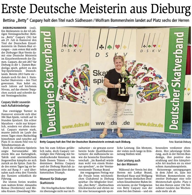 Ein Meilenstein in der 63-jährigen Vereinsgeschichte: Bettina „Betty“ Caspary (56) hat am 29. Juni in Hannover den Titel der Deutschen Einzelmeisterin im Damen-Skat errungen – zum ersten Mal stellt der Dieburger Skat- Club damit eine Deutsche Meisterin im Einzelwettbewerb der Damen.